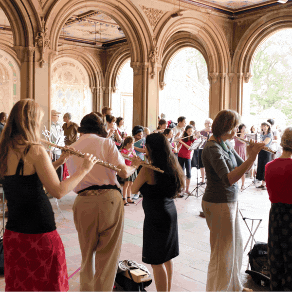 Inspired by Phil Kline’s Unsilent Night, MMNY launched its first winter festival, “Make Music Winter,” with twelve participatory musical parades on the winter solstice (December 21st). Meanwhile, the summer offerings became larger-than-life: 99 percussionists, 88 street pianos, 24 hours of theremin under a bridge, a “Funk Island” on Rikers complementing “Punk Island” on Governors, dozens of participating NYPL branches, and more music around the Central Park Lake. View the full program here.
